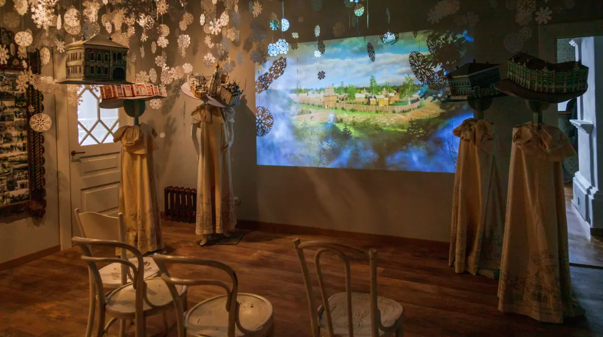 На втором этаже показывают фильмы о Вологде, от основания города до советского времени. С восстановленного по архивным фото балкона открывается вид на ансамбль Вологодского кремля.