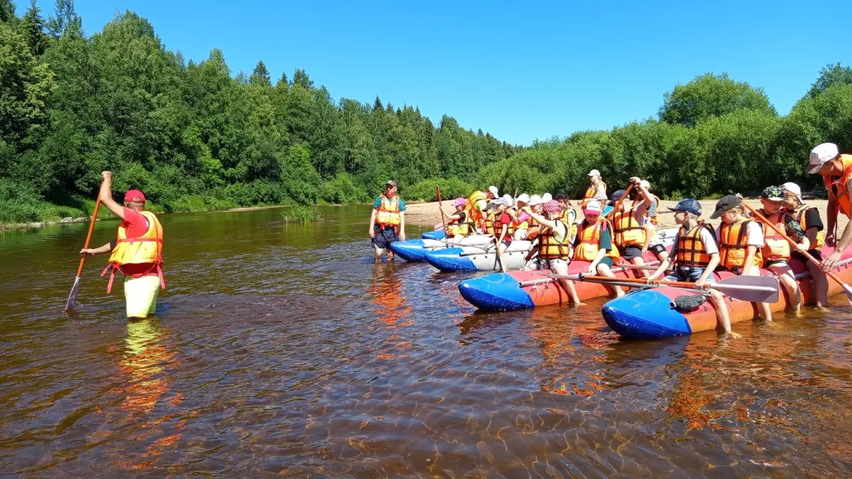 Участники смен проходят теоретическую и практическую подготовку к водным походам, включая изучение снаряжения, сборку катамаранов, технику гребли и основы безопасности на воде. В рамках обучения дети совершают учебный сплав по реке Сухоне первой категории сложности, отрабатывая полученные навыки в районе лагеря и на острове Дедов.
