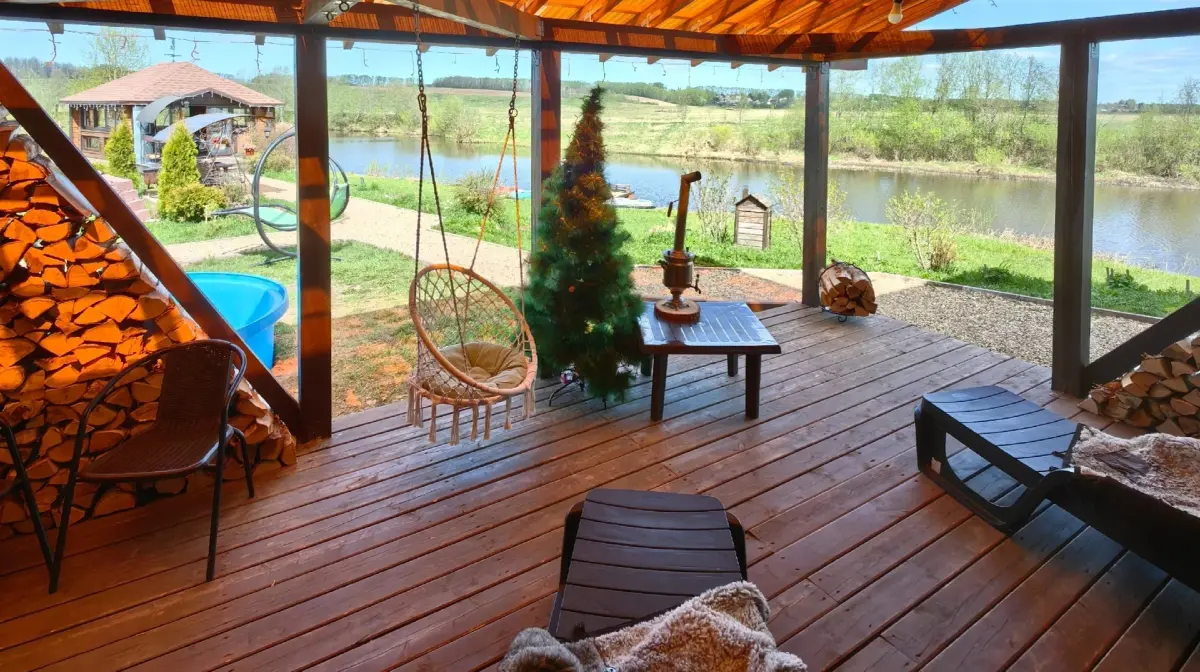 ✓ Зоны отдыха. Большая застеклённая беседка с мангальной зоной, коптильнями, казанами и самоваром. На территории также есть терраса с гамаками и подвесной кроватью, качели, батуты, спортгородок, футбольное поле, настольные игры.