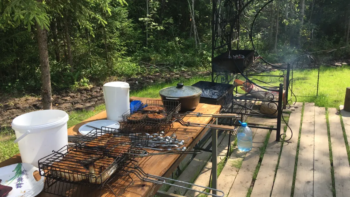 На базе расположены два просторных дома, каждый из которых вмещает до 15 человек. В каждом доме также имеется мангальная зона.