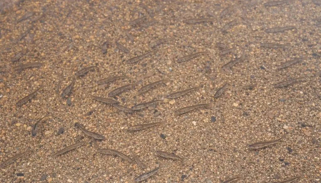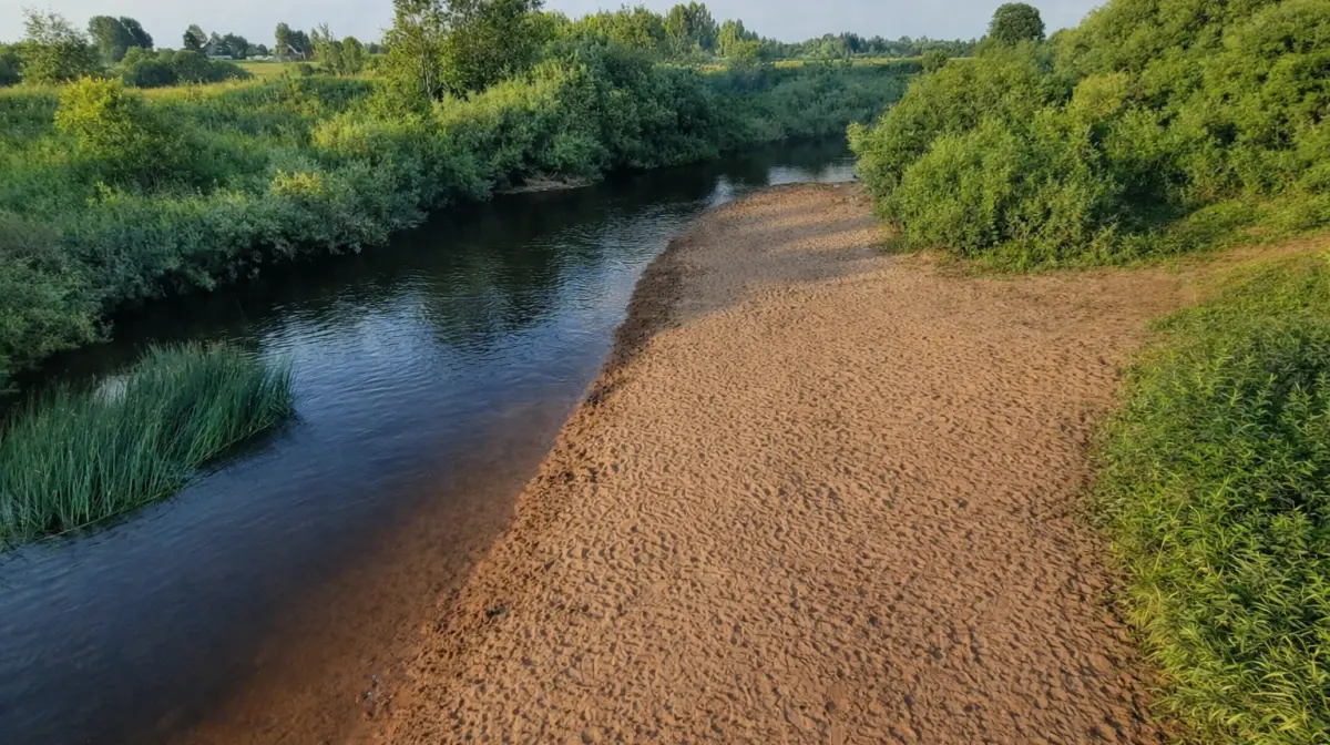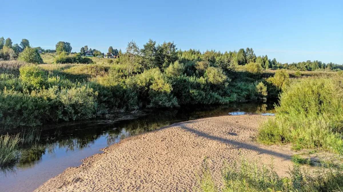 Отличное место, чтобы приехать с детьми: река мелкая и узкая. Если уйти правее, то там будет поглубже. Плавают мальки рыб, которых можно покормить. Песок чистый и не крупный. В жаркую погоду народу может быть много, но обычно места всем хватает.