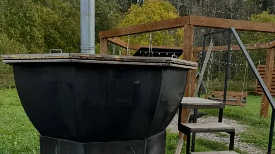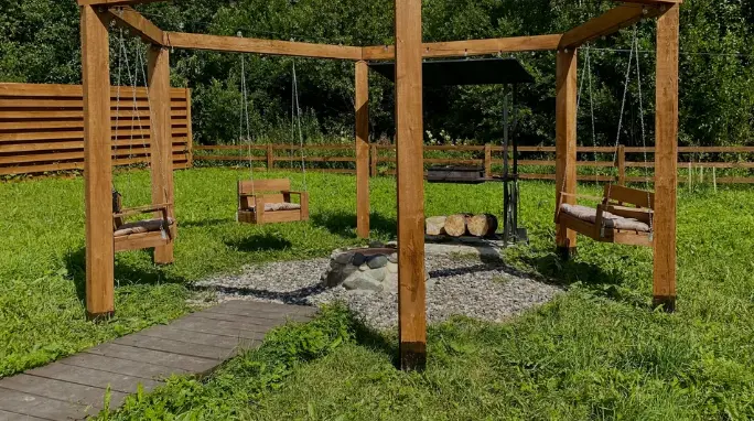 Оба домика со своей территорией, окружённой забором. У каждого есть баня и чан, а также мангальная зона и качели у костра.