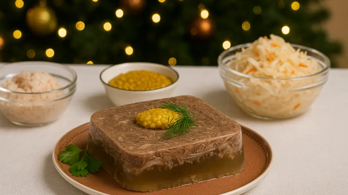 Холодец традиционно подают с хреном, горчицей или квашеной капустой.