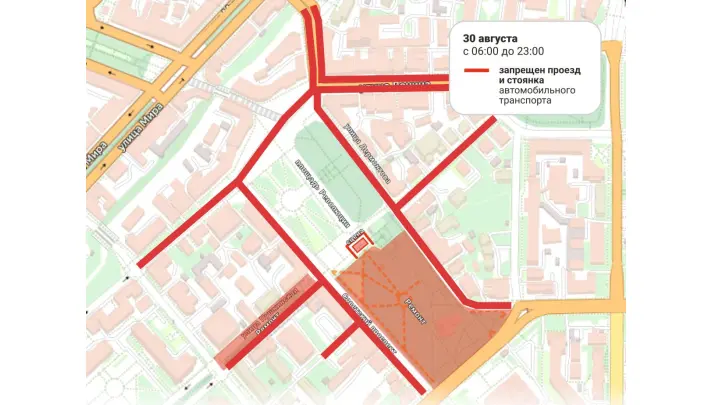 - В целях обеспечения безопасности 30 августа с 6:00 до 23:00 вводится временное ограничение движения и парковки транспорта на центральных улицах: