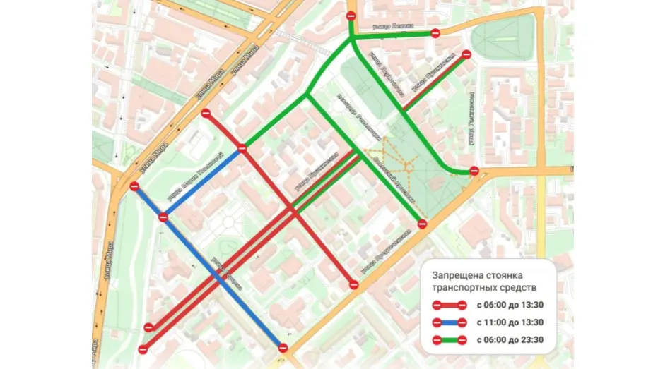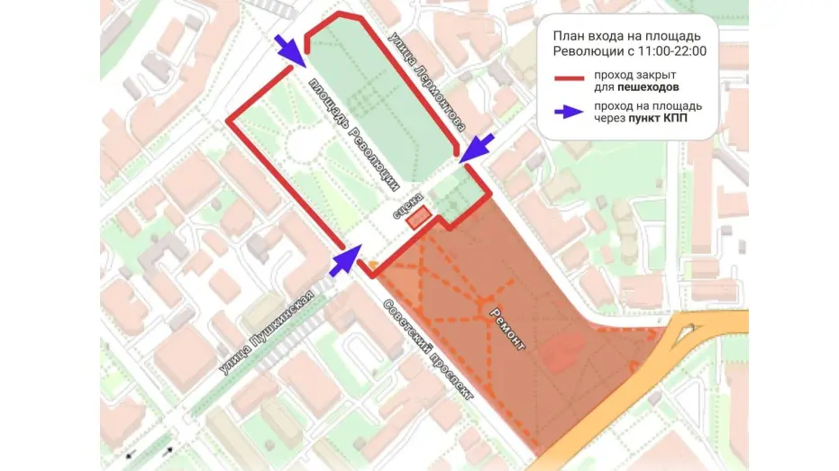 Кроме этого будет ограничен вход на пл. Революции, он будет осуществляться через три пункта: с ул. Пушкинской (со стороны Советского пр. и ул. Лермонтова), с пл. Возрождения.