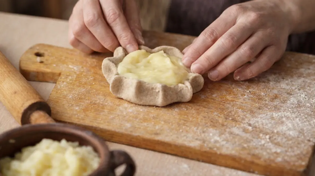 - ✓ Раскатайте тесто в круглые заготовки размером с блюдце, выложите в центр начинку и аккуратно защипните края, формируя бортики.