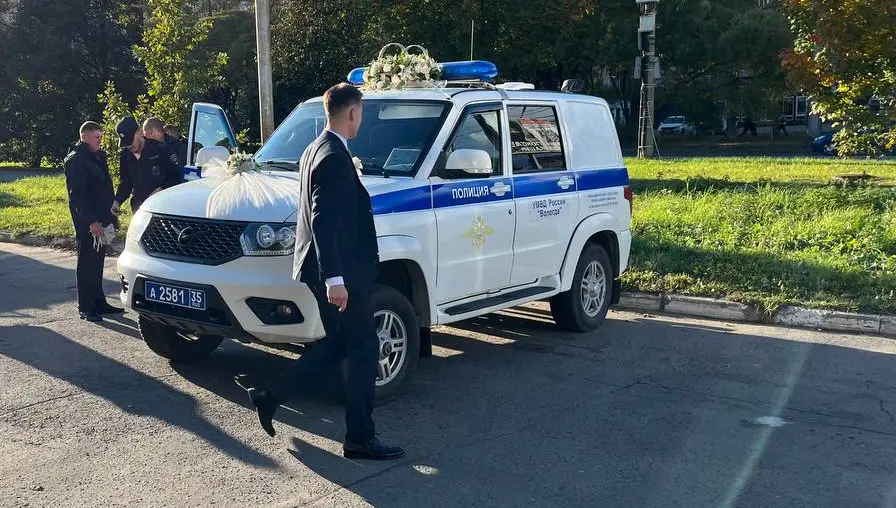 24 сентября по улицам Вологды ездил полицейский автомобиль со свадебными украшениями.