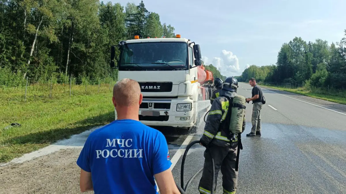 Водитель заметил дым из-под кабины и остановился на обочине. При осмотре было обнаружено возгорание электропроводки. Мужчина оперативно вызвал экстренные службы. На место оперативно прибыли сотрудники полиции, которые организовали безопасность движения на участке. Пожарные ликвидировали возгорание, предотвратив утечку топлива. Пострадавших нет.