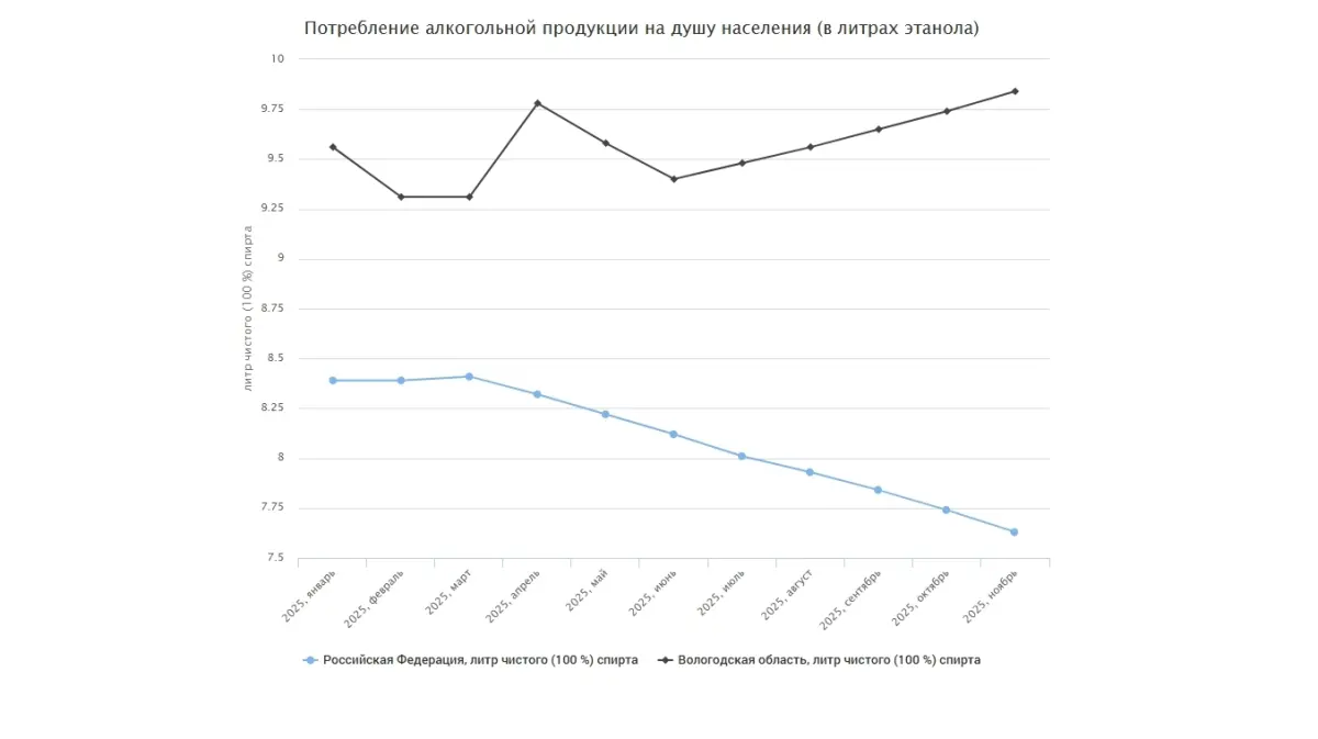 В ноябре на Вологодчине потребление выросло до 9,84 л спирта, по данным государственного ресурса ЕМИСС. В среднем по стране потребление снижается.