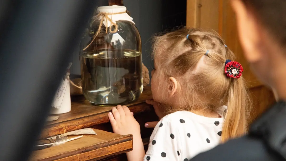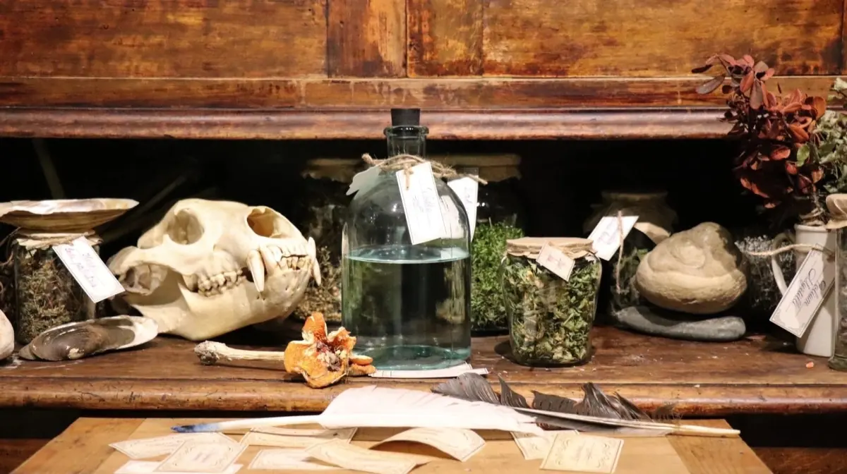 Особое внимание привлекает «зелейная лавка». За занавесом скрывается атмосфера средневекового прототипа аптек: висящие под потолком травы, банки с ящерицами и змеями в формалине, старинные гербарии и чучела животных.