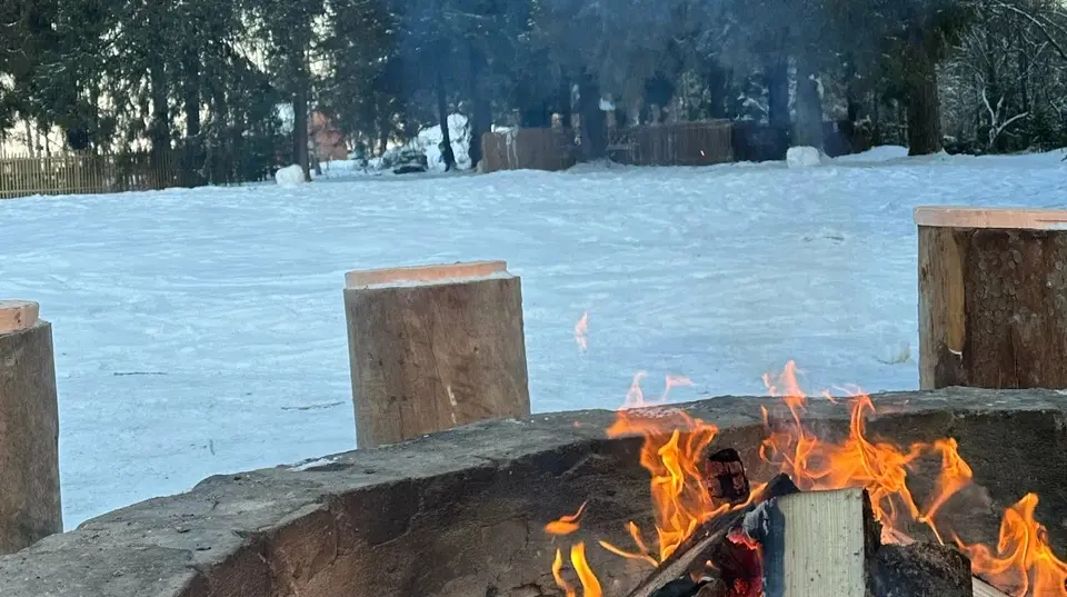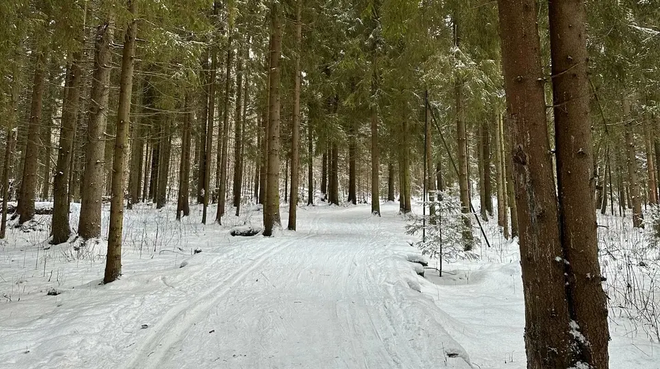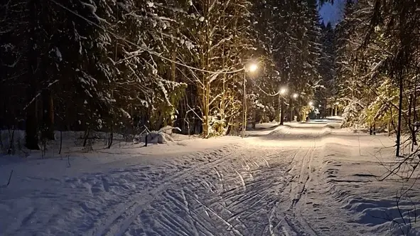 Каток и горка пока не работают. Зато готова лыжная трасса: 3 км по живописному лесу. Есть освещение.